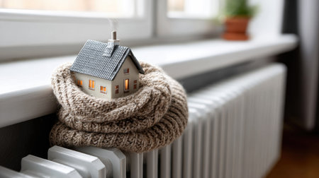 A miniature house sits comfortably wrapped in a soft woolen scarf on a radiator, highlighting themes of warmth and coziness in home design.