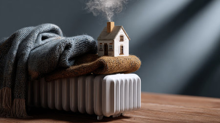 A miniature house model sits atop folded knit blankets on a radiator, creating a cozy home atmosphere. This image conveys warmth and comfort within a stylish interior.