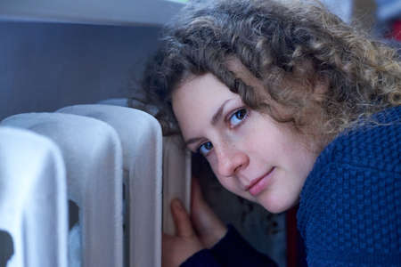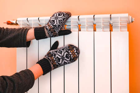 The woman keeps her hands on the radiator and warms up, heating season concept.
