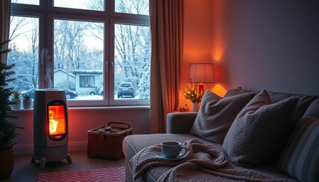 This image captures a stylish electric heater radiating warmth in a cozy living room. Soft textiles and modern furniture create an inviting atmosphere perfect for relaxation.