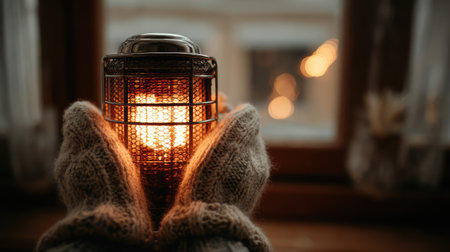 A pair of cozy, knitted mittens cradle a glowing lantern, evoking warmth and tranquility on a chilly winter evening by the window. A soft ambiance fills the space.