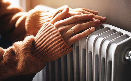Warm hands resting on a white radiator in a cozy indoor setting during a chilly day
