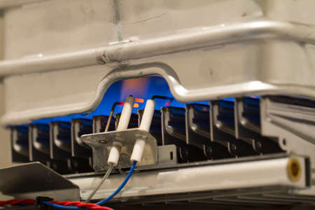 Close-up detail of a domestic gas water eater boiler, blue flames are visible inside.