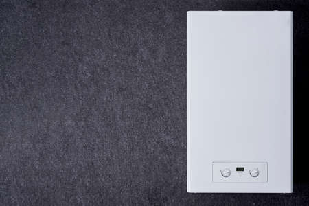 White modern home gas boiler mounted on a grey wall on a kitchen. Water heater. Water heating, ecology.