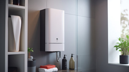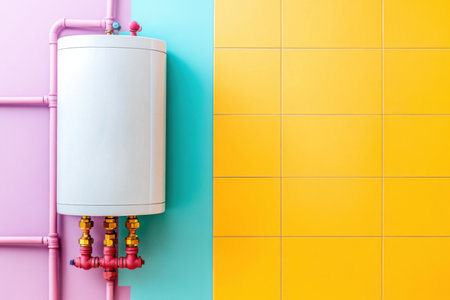 Detailed view of a sleek water heater boiler on a brightly tiled bathroom wall featuring neatly arranged pipes and colorful tiles. Ideal for showing casing plumbing installations in residential settings.
