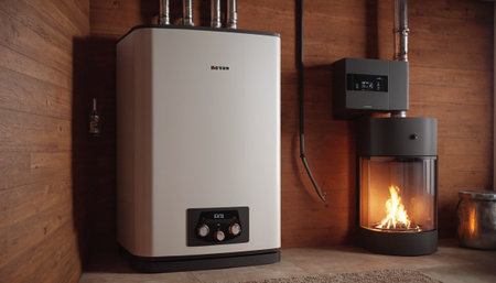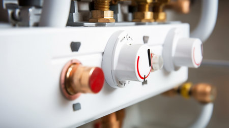 Close-up of control panel of gas boiler with dials and pressure gauge, showing heating settings and temperature indicators in domestic environment