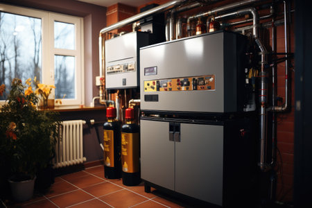 autonomous heating boiler with control panel, buttons, display with temperature indicator and valves on pipes at home kitchen