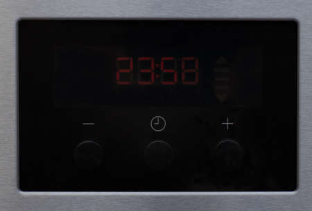 Control panel with red digits on electronic timer display, buttons and round knobs on modern white kitchen electric stove front view closeup