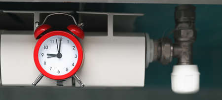 Heating radiator in office, close up. White heat exchangers. Iron aluminium steam radiator. Pipe pattern.