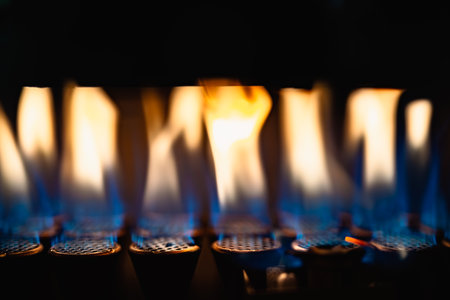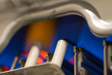 Close-up detail of a domestic gas water eater boiler, blue flames are visible inside.