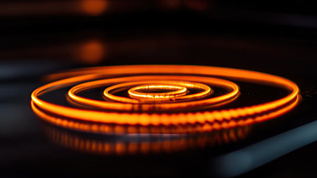 This abstract close-up showcases a glowing orange spiral pattern created by an electric burner. The mesmerizing glow contrasts against the dark surface, highlighting modern kitchen energy in a vibrant and artistic way.