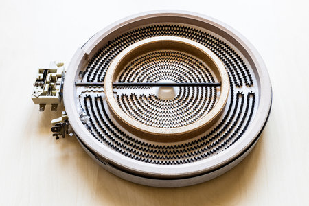 open-coil burner from ceramic heating hob of kitchen electric stove on light brown wooden board