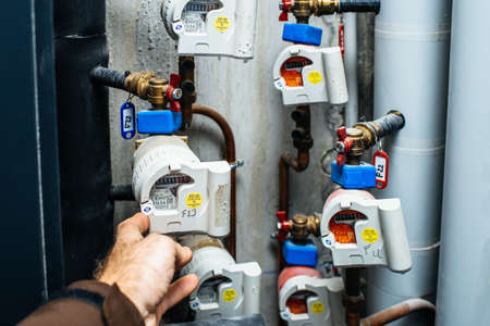 Paris, France - Dec 26, 2018: Worker man servicing industrial drawer with multiple water and heating counters on pipes of a modern apartment office building