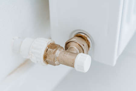 Metal part from battery. Thermostatic valve for heating radiator. Heating in the house. White minimalistic interior. High quality photo