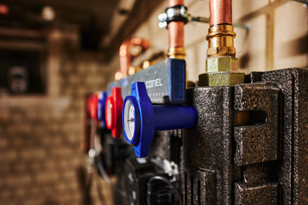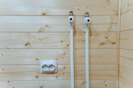 Cold and Hot Water Valves Inside Wooden Built Residential Building. HVAC Theme.