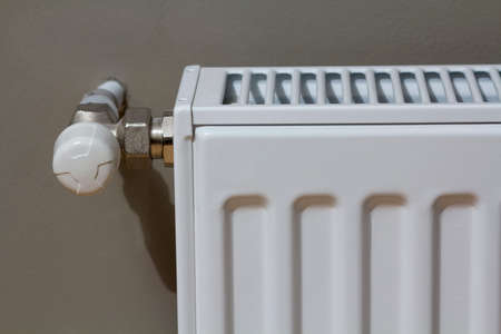 Close-up of valve of heating radiator of white on a grey wall.