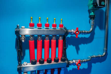 Collector system for underfloor heating. Underfloor heating manifold on a blue wall background. Concept - installation of underfloor heating in the house. Buying a collector system for your home