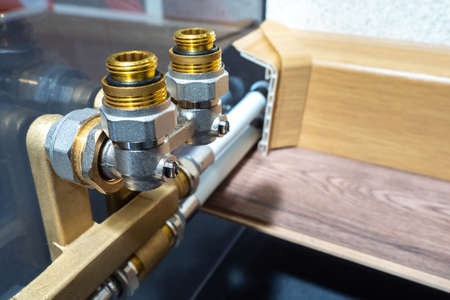 Lower radiator connection assembly. Elements for connecting a heating radiator. Two heating pipes next to baseboard. Concept - sale of fittings for radiators. Radiator fittings close-up.