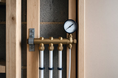 Pressure gauge attached for testing new brass distribution system manifold valves mounted for central heating floor in a residential building under construction.