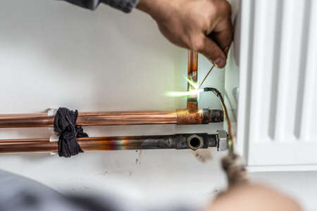 Close up on hands Unknown industrial worker plumber with central heating copper pipes welding using gas torch or blowtorch on the wall in house building or apartment - real people at work copy space