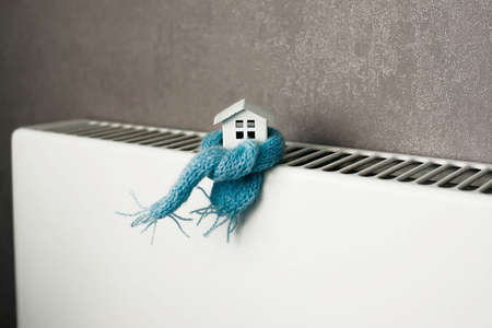 Concept of heating season with wooden houses on radiator.