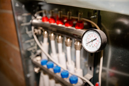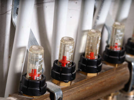 Berlin, Germany - January 31, 2022: Heating system under construction with a view to the thermometers of the heating circuits.