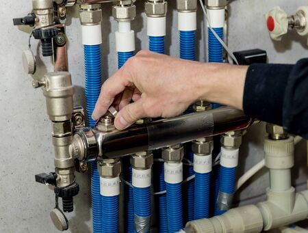 HVAC Heating Technician Making Final Check of the System. Checking All Hot Water Valves, Pipelines and Counters.