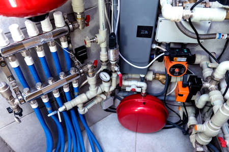 Modern heating system in boiler room. Automatic control unit. Engineering systems for home.