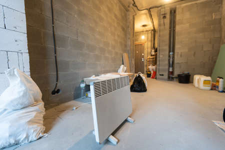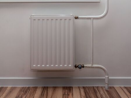 White heating battery on the background of the building wall, during the renovation of the house.