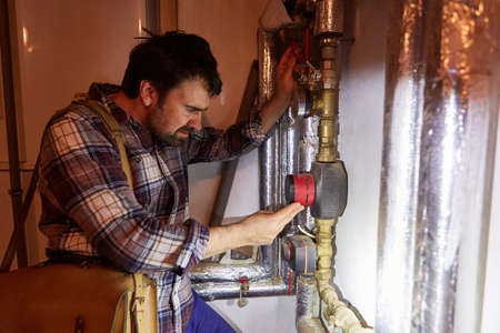 The heating installer checks the circulation pump of the heating system in the basement during maintenance