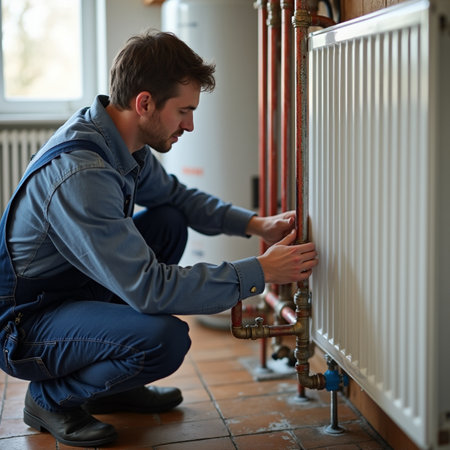 Portrait of a young male plumber repairing heating radiator at home
