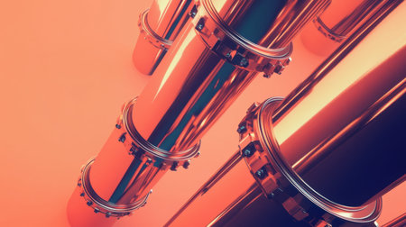 This abstract image captures a dynamic arrangement of metallic pipes with a reflective surface, set against a vibrant orange background, evoking a modern industrial feel.