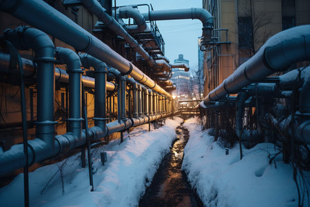 Metallic Winter metal pipes. Industrial pipeline. Generate Ai
