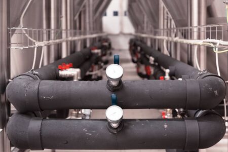 Heating pipes. City communications. Lots of stainless steel sheathed pipes. Industrial equipment. Hot water dispenser.