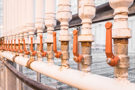 Orange handles on white pipes at a factory