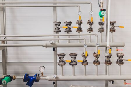 old heating system of an industrial building with many pipes and pressure gauges