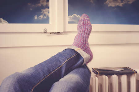 Legs on radiator. Warming by the radiator.