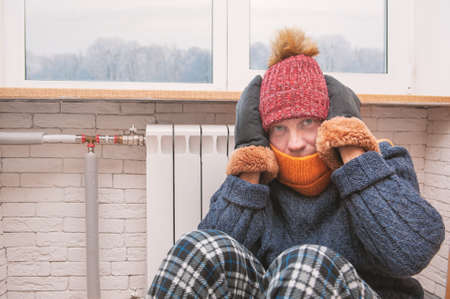 Man feeling cold in hat and pullover sitting close to radiator. gas crisis concept