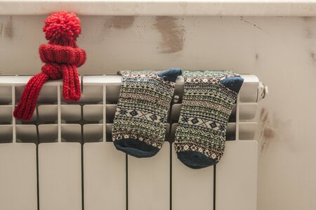 Concept of heating season with knitted clothes on radiator.