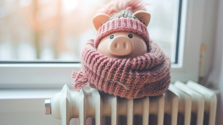 a piggy bank adorned with a winter hat and scarf, positioned next to a warm radiator in a cozy home interior, leaving ample space for text on the right side