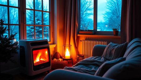 Glowing heater providing warmth and comfort on a windowsill while raindrops fall against the window, creating a serene, cozy atmosphere inside during a cold night