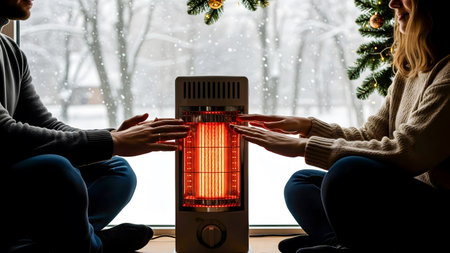 Man and woman in warm sweaters sitting on the windowsill and warming their hands with a red electric heater in winter