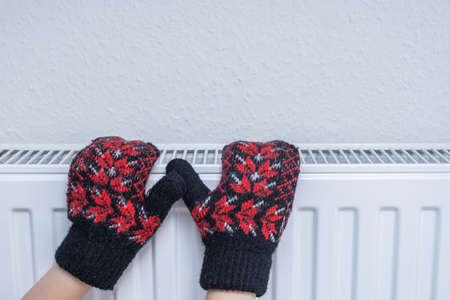 Hands in mittens on the radiator. Low temperature in houses in winter.