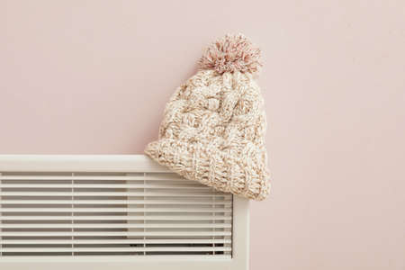 Concept of heating season with knitted hat on radiator.