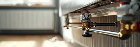 Close-up of a new radiator or heating system being installed. The installer is connecting pipes and valves, ensuring a comfortable home environment.