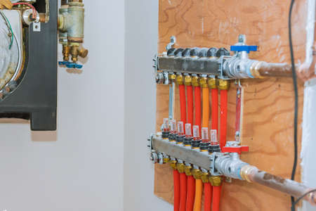 Pipes on central heating distributor of central heating with red valves