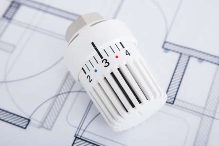 Closeup photo of heater thermostat on blueprint
