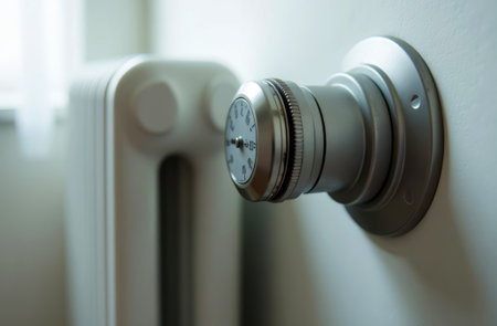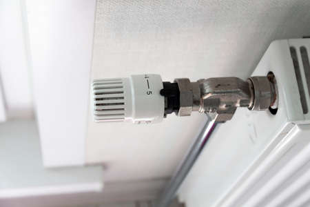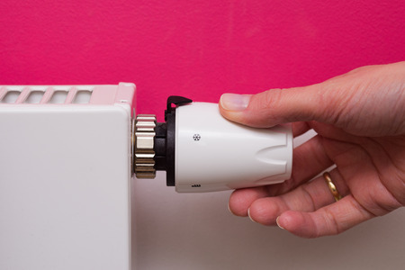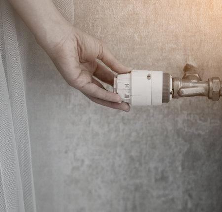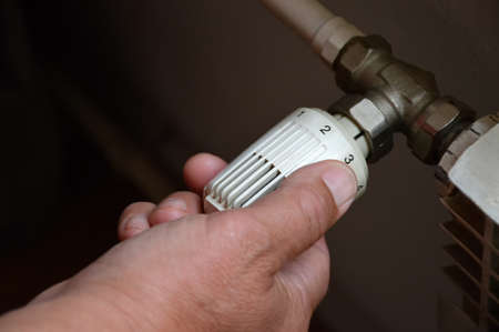 Close up of a person's hand adjusting a radiator thermostat at home - Image