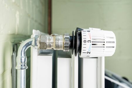 white modern heating knob on low battery mode for heating in apartments and houses. Heating prices.
