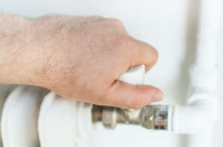 Man hand regulates temperature knob of the heating radiator to reduce heating costs.